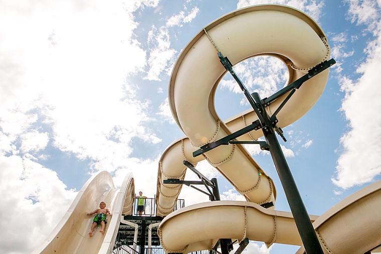 A lifeguard watches from the top of the slide as children enjoy the first day of summer Friday afternoon at Woodland Water Park in Kalispell. June 20, 2014 in Kalispell, Montana. (Patrick Cote/Daily Inter Lake)