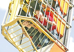 Ethan Beck, left, and Colton Howard aboard the "Skymaster" ride at the Paradise Carnival during Logger Days Saturday.