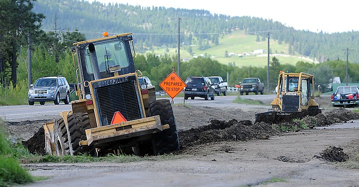 Traffic slows down for road construction on the side of U.S. 2 west of Kalispell on Monday. (Brenda Ahearn/Daily Inter Lake)