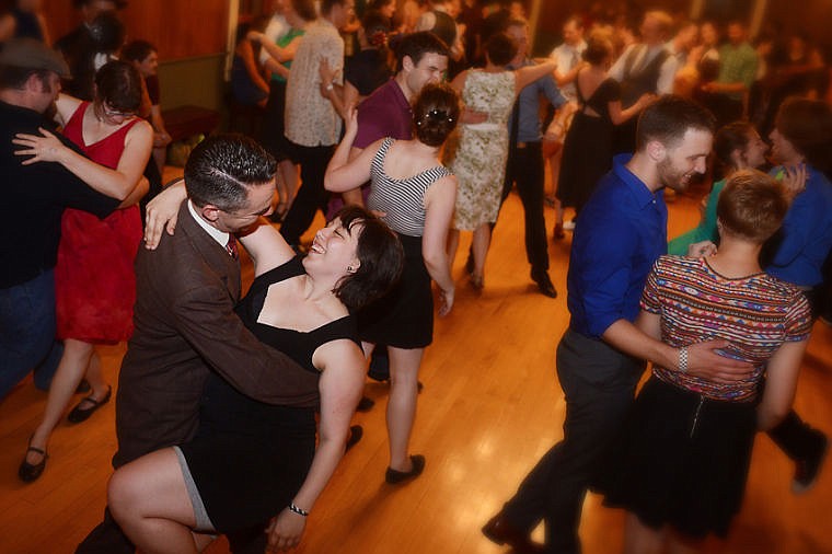 <p>Emilie Erler of Whitefish, lower right, dances with Jonathan de Caussin of Bozeman at the Big Sky Workshop on Sunday, June 22, in the Sassafras Ballroom in Kalispell. (Brenda Ahearn/Daily Inter Lake)</p>
