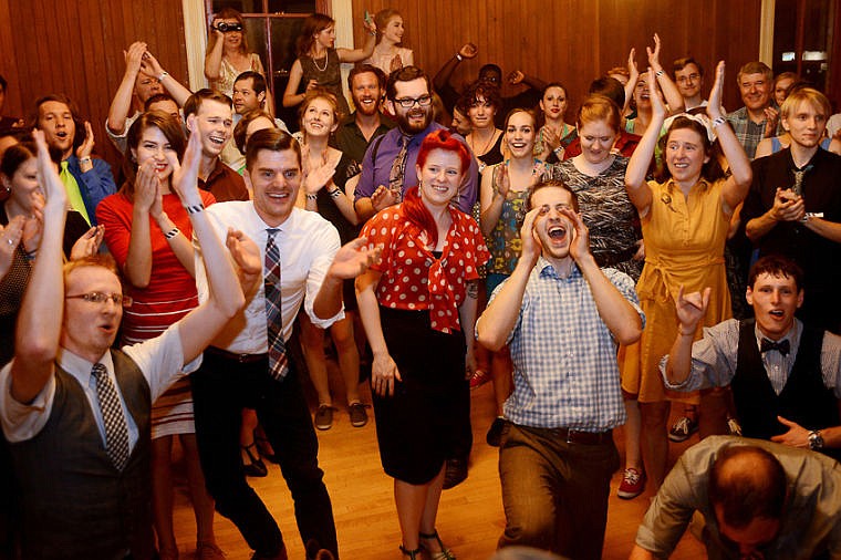 <p>Dancers gather to cheer as Michael "Falty" Faltesek of Falty and the Defects wraps up a set with the Solomon Douglas Trio at the final dance of the Big Sky Workshop on Sunday, June 22, in Kalispell. (Brenda Ahearn/Daily Inter Lake)</p>