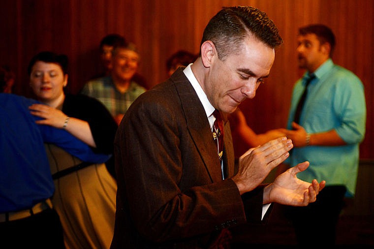 <p>Peter Flahiff of Santa Ana, California, smiles as he dances at the Big Sky Workshop on Sunday, June 22, in Kalispell. Flahiff has been coming to Montana for five years and takes great joy in watching the swing scene in Northwest Montana grow and grow. Attendance at the workshop this year was nearly double that of 2013. More than 120 dancers from around Montana, Washington, Colorado and California attended this four day event. (Brenda Ahearn/Daily Inter Lake)</p>
