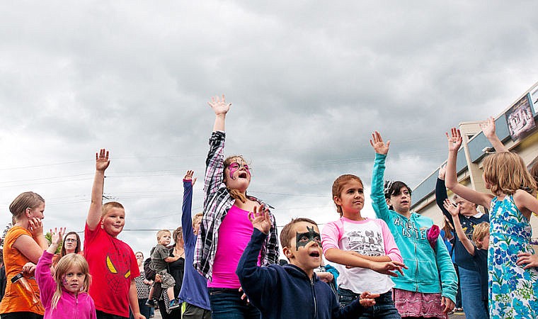Children raise their hands in hopes of getting free goodies during a prize giveaway Friday afternoon during the street festival to celebrate Flathead Industries 40th anniversary. June 27, 2014 in Kalispell, Montana. (Patrick Cote/Daily Inter Lake)