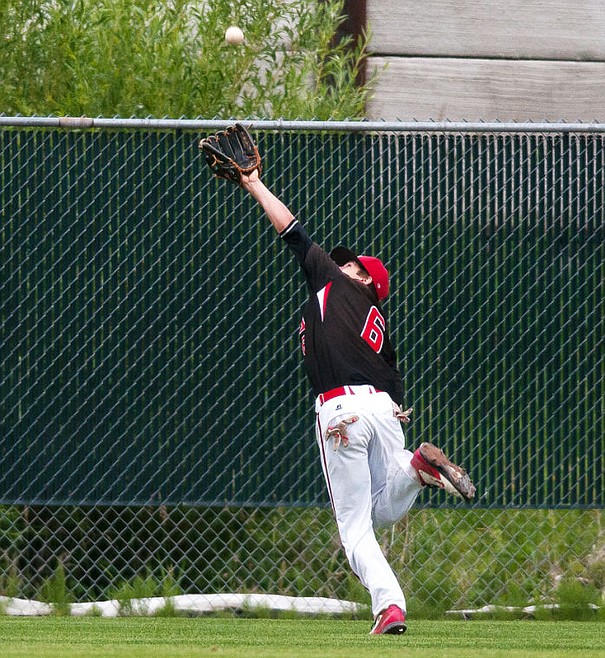 Kalispell center fielder Jake Barstow makes a grab near the fence to get the first out during the second game Friday evening of an American Legion AA baseball doubleheader against the Billings Scarlets at Griffin Field.