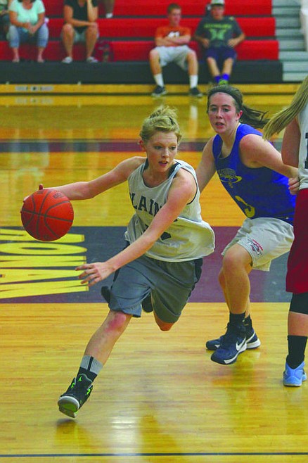 Kimberly Earhart of Plains maneuvers down the court during the team's tournament in Ronan.