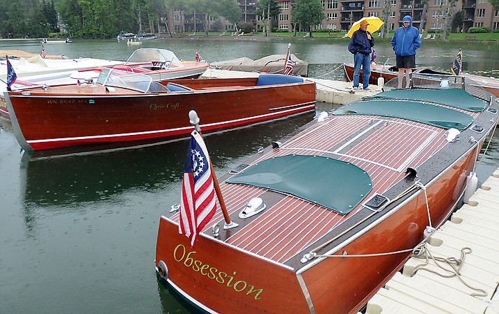 Ron Yandt, left, and his son Wes Yandt take an early morning walk though at the Whitefish Woody Weekend III on Saturday, June 28, in Whitefish. They brought in a boat for the show from the Spokane Valley. (Brenda Ahearn/Daily Inter Lake)