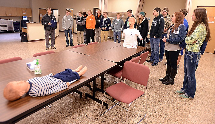 Mike McGarvey, left, leads a group of STEM students from Columbia Falls, Flathead and Glacier high school tour the Rebecca Chaney Broussard Center for Nursing and Health Science at the College for a Day event at Flathead Valley Community College on Tuesday, March 4. More than 700 high school students from around the area made it out for the event. (Brenda Ahearn/Daily Inter Lake)