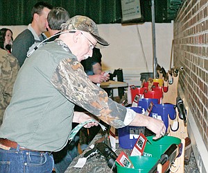 Mike Munro deposits tickets for a chance to win a Mossberg 12 ga. Friday night during the Friends of the NRA dinner at the Memorial Center.
