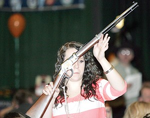 Jordan Refsland displays the Henry Golden Boy .22 magnum rifle which garnered $925 during the live auction Friday night at the Friends of the NRA dinner.