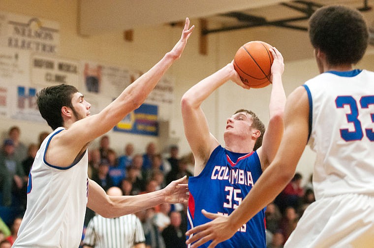 Columbia Falls senior Jared Trinastich (35) pulls up to shoot Thursday night during the Vikings victory over the Wildcats at Bigfork High School Feb. 6, 2014 in Bigfork, Montana. (Patrick Cote/Daily Inter Lake)