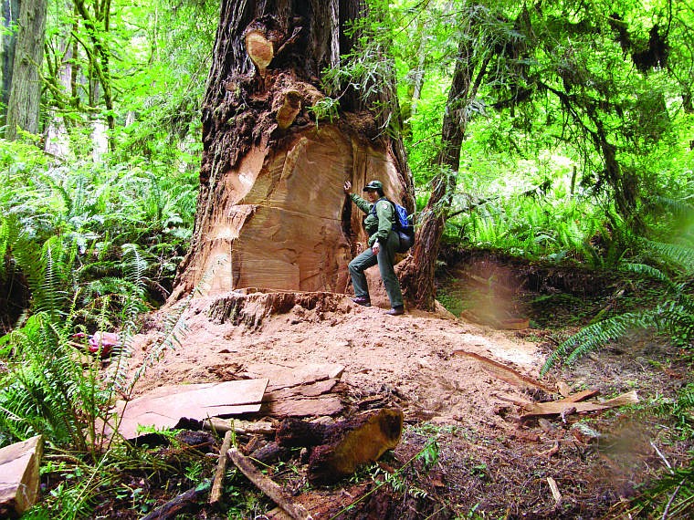 Wildlife biologist Terry Hines stands next to a massive scar on an old-growth redwood tree in the Redwood National and State Parks near Klamath, Calif., where poachers have cut off a burl to sell for decorative wood.