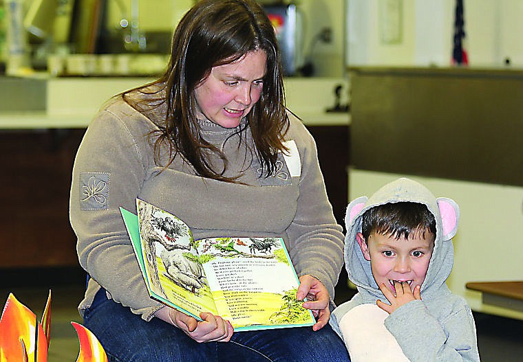 Theressa Miner reads to the children in Trout Creek School at Family Fun Night. Her son Fletcher Segura listens patiently at her side.