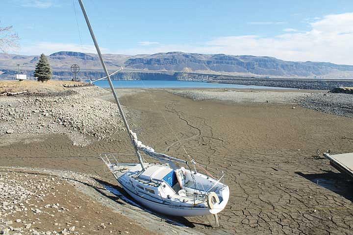 Boat ramps in the Wanapum and Priest Rapids reservoir are closed and at least one sailboat was docked on the river, lying crooked on dry ground.