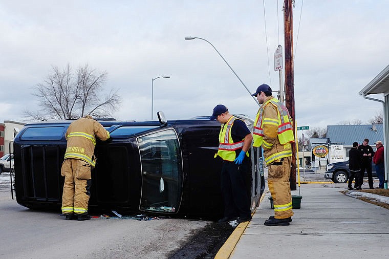 Kalispell Fire and Police respond to a vehicle rolled over Friday afternoon. The SUV rolled after being struck by van at the intersection of Center Street and Second Avenue East in Kalispell. March 7, 2014 in Kalispell, Montana. (Patrick Cote/Daily Inter Lake)