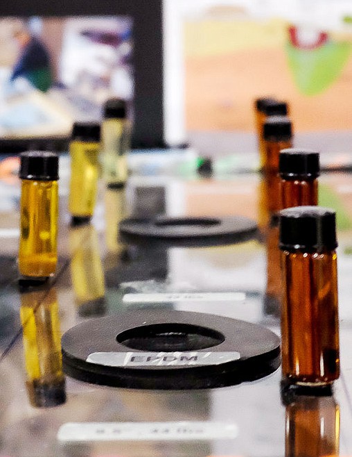 Halbran tested 72 gaskets over four weeks. The 48 gaskets she had in a sealed display showed some expansion, shrinkage and liquid seepage. Halbran also did a stretch test after the gaskets soaked in the chemical solutions to test breakage.