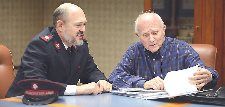 David Mirisch, right, works with Salvation Army Maj. Steve Svenson on the upcoming "We Can Swing It" fundraiser in Kalispell. (Brenda Ahearn/Daily Inter Lake)