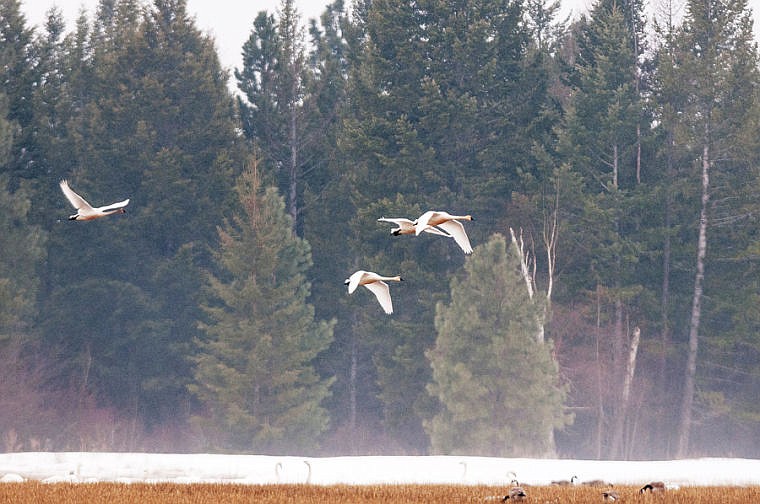 Canada geese and trumpeter swans in a field Monday morning near the intersection of U.S. 2 and Montana 40. (Patrick Cote/Daily Inter Lake)