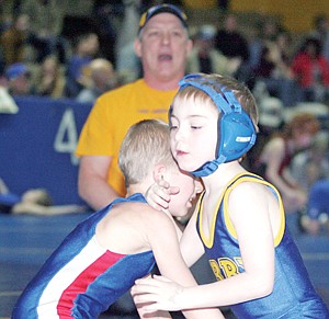 Battle of the six-year-olds with Teague Thompson, right (with his dad Dean Thompson looking on) vs. Rebel Crump at Peewee 45.