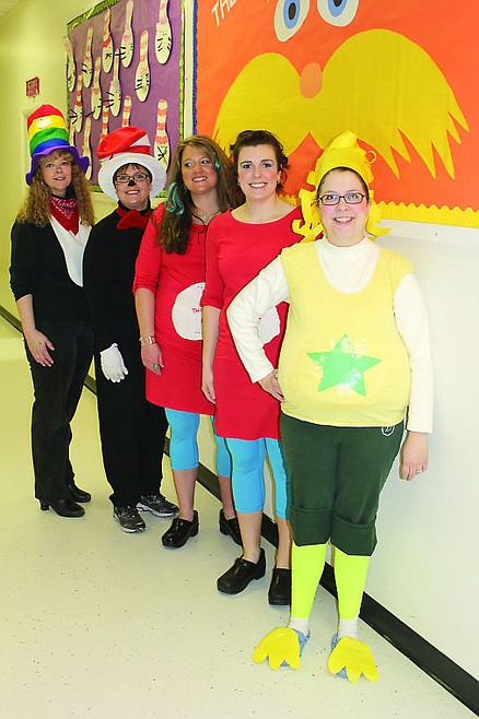 Plains Elementary School teachers Beth Junge, Denise Montgomery, Dana Diehl, Marie Errecart and Nichole Cockrell help students celebrate the birthday of Dr. Seuss.