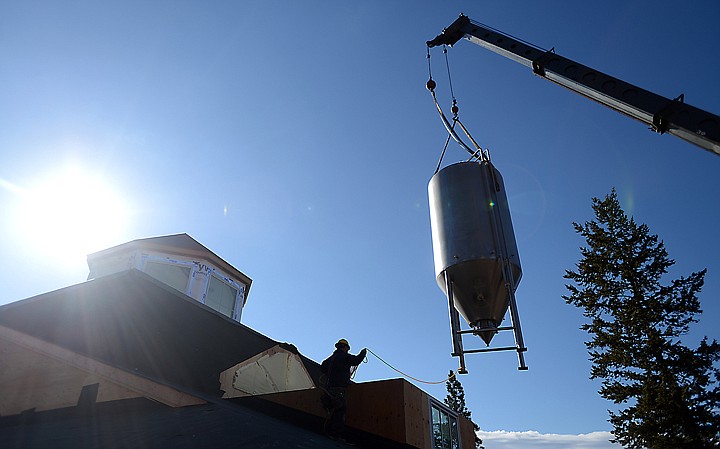 Eight new 2,325 gallon fermentation tanks are delivered to the new Flathead Lake Brewing Company on Thursday, March 13, in Bigfork. Construction continues and the company is hoping to be open for business in May. (Brenda Ahearn/Daily Inter Lake)