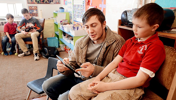 Flathead High School senior Vladimir Kigilyuk reads with St. Matthew’s first grader Noah Sonju.