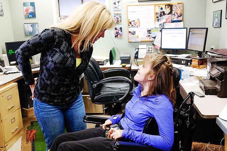 Sabrina Wisher jokes around with her daughter Mikayla in the office of Wisher Salvage in Kalispell on Thursday afternoon. March 13, 2014 in Kalispell, Montana. (Patrick Cote/Daily Inter Lake)