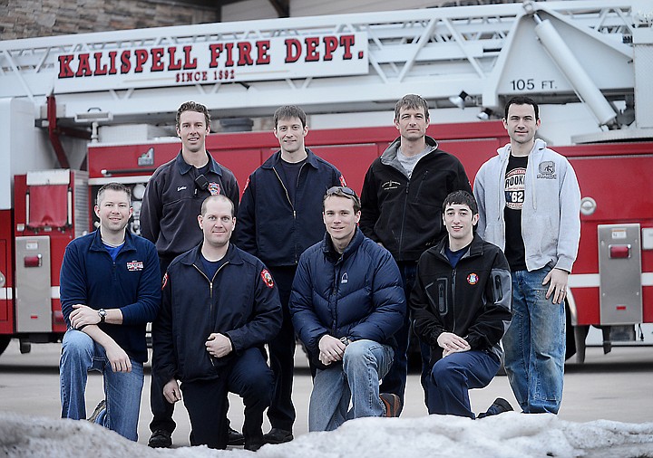 Local firefighters from Kalispell and Whitefish are home after competing the the 23rd annual Scott Firefighter Stairclimb to benefit the Leukemia and Lymphoma Society on Sunday, March 9, 2014. The event takes place at the Columbia Center, the tallest skyscraper in downtown Seattle. According the official website 1,800 firefighters from around the world came to the event to participate in the 69 flight climb including front row, from left: Joe Hansen, Jake Felts, Kyle Gully, and Sal Baccaro (one of two members from the Whitefish Fire Department), and row two, from left: Soren Koetter, Don Thibert, Ben Graham, and Josiah Mooney. Jon Campbell and Sarah Peterson also competed, but were not able to be present for the photo. The team raised more than $8,000 dollars and came in 11th over all. (Brenda Ahearn/Daily Inter Lake)