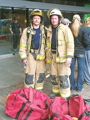 Libby Volunteer Fire Department members Scott Beagle and Ryan Andreessen raised more than $1,800 for their efforts climbing a skyscraper in full firefighter garb.