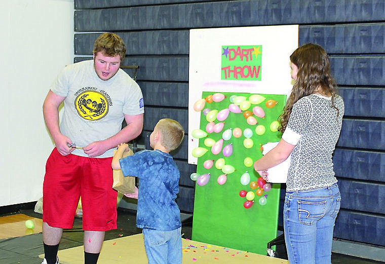 National Honor Society member Ben Gorham helps a younger student play a balloon dart game at the student-run after school carnival.