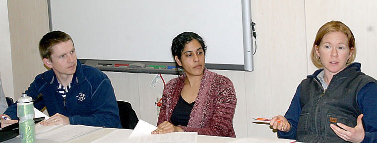John Carpenter and Kavita Bay listen as Jessie Nichols discusses the school's lunch program at the Alberton School Board of Trustees meeting.