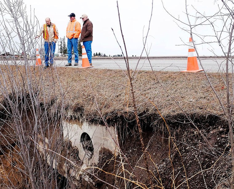 Flathead County Road and Bridge workers inspect a large washout Thursday afternoon on Columbia Falls Stage Road.