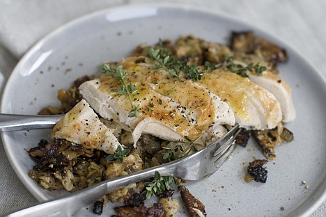 Since Passover is coming up, I decided to play around with a matzo-based herb stuffing. But if you'd rather stick with a more traditional stuffing base, the same technique works just as well.