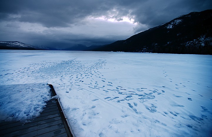 Foot prints can be seen in the snow over a frozen section of Lake McDonald near the dock at Apgar on Wednesday morning, March 26, in Glacier National Park. (Brenda Ahearn/Daily Inter Lake)