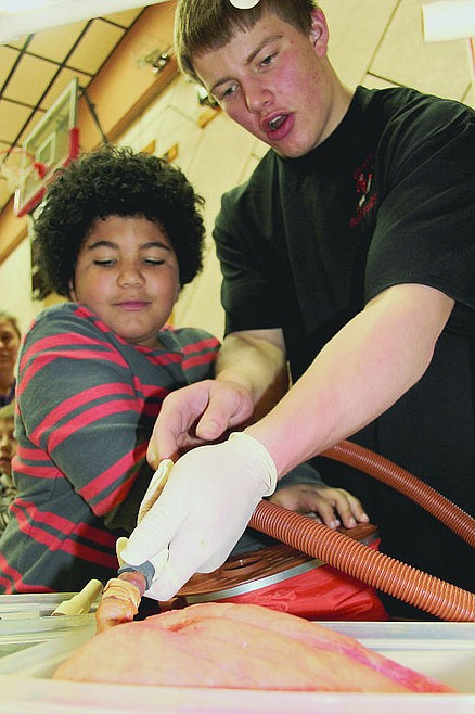 Kade Hill and Gary Wadman work to blow up an artificial lung during the Noxon Kick Butts event. The event geared towards teaching kids the effects of tobacco.