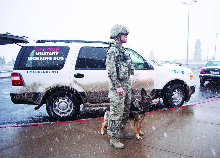 Sr. Airman Jessica Woodall and German shepherd dog Gina prepare to search Columbia Falls Junior High School for explosives Thursday night.