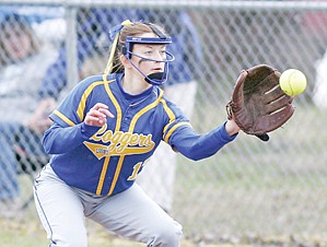 Second baseman Rachel Rebo backs up Devon Gallagher at first for the second out top of 2 vs. the Priest River Spartans. The Lady Loggers went on to win the 7-inning contest 8 to 3 on a very soggy field.