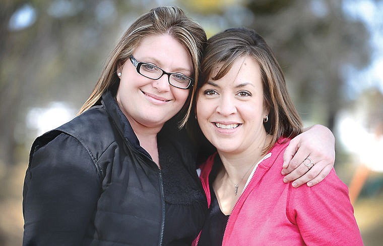 Vivian Gelormino, left, and her best friend Sarah Lynch on Tuesday, March 25, near Helena Flats. Gelormino is trying to raise $30,000 for Lynch's cancer treatment bills by April 30th. If she succeeds she will shave her head. (Brenda Ahearn/Daily Inter Lake)