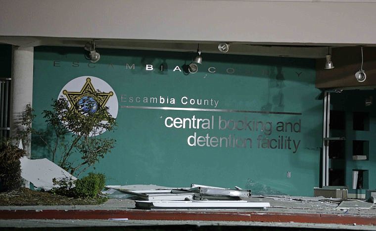 Debris is scattered on the sidewalk in front of the Escambia County Jail after an explosion forced the evacuation of the facility, Thursday in Pensacola, Fla. (AP Photo/John Raoux)