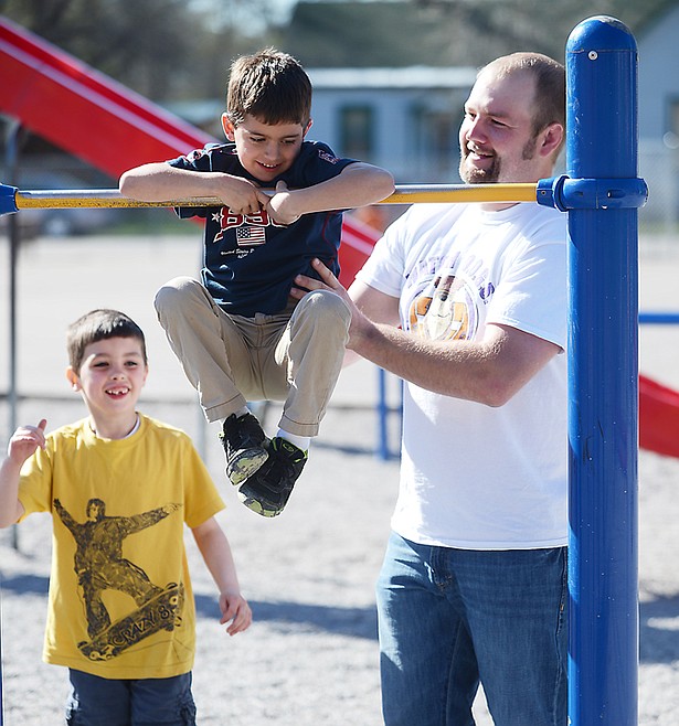 Keevin Bertelsen, part of the Watch DOGS, program helps Miles Sands, center, and Dawson Duncan, at Elrod Elementary on Thursday, May 1, in Kalispell. (Brenda Ahearn/Daily Inter Lake)