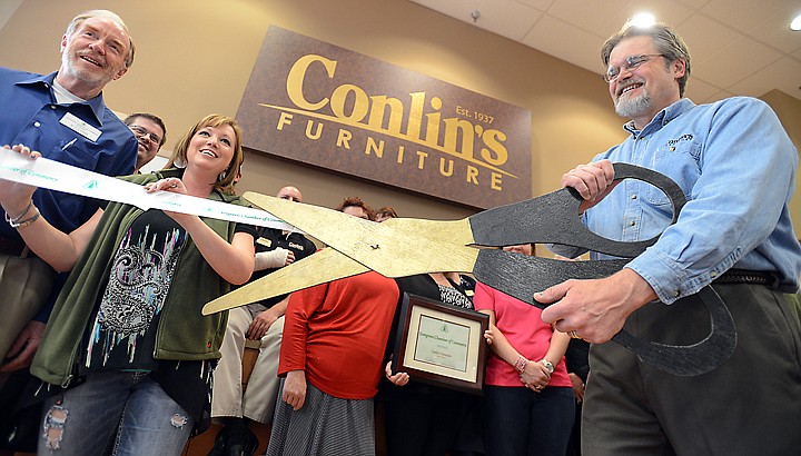 B.J. Lupton, president of the Evergreen Chamber of Commerce, left, looks on as Scott Hansen, general manager of the Conlin's Furniture Evergreen store, cuts the ribbon at the grand opening on Friday, May 2. Conlin's, which became Al's Furniture in 2009, is once again Conlin's. (Brenda Ahearn/Daily Inter Lake)