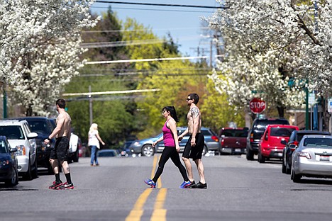 <p>GABE GREEN/Press</p><p>Pedestrians cross South Fifth Street in Coeur dAlene Wednesday afternoon. Temperatures reaching the mid 70s brought an abundance of locals to the downtown area.</p>
