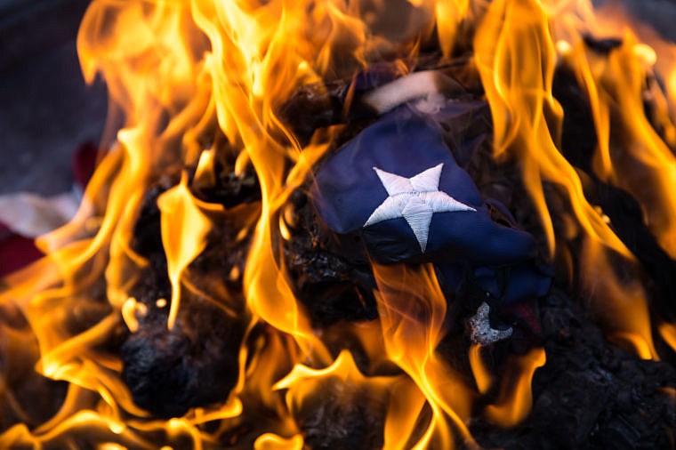 <p>GABE GREEN/Press</p><p>A United States flag holds on to its last remaining star as it is retired by Roger Cohen, air force, Ben Chaffin, marines, John Davis, army, and Bill Davis, army, Saturday evening at the Post Falls Eagles club.</p>
