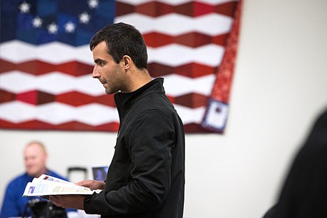 <p>GABE GREEN/Press</p><p>During the Hero 2 Hired job fair for veterans, active duty, national guard and reserve, and military spouses, Kendrick Jimenez, who served in the Navy for four years, talks with North Idaho College representatives Thursday at the Post Falls American Legion.</p>