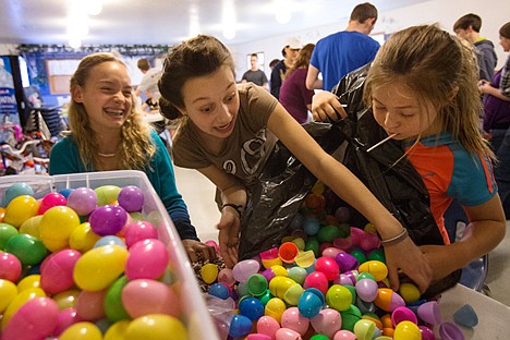 <p>GABE GREEN/Press</p><p>Zoe Hembry, 11, middle, reacts as she dumps empty plastic eggs onto a table for filling with Lily Foster, 12, left and Mackenzie Walton, 11, right, Wednesday night as a youth group puts candy in about 10,000 plastic eggs at the Christian Center School in Hayden for an Easter egg hunt this weekend.</p>