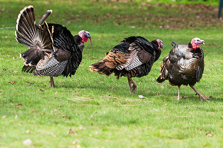 <p>SHAWN GUST/Press</p><p>A trio of wild toms graze through a neighborhood Monday while foraging for food near Tubbs Hill in Coeur d’Alene.</p>