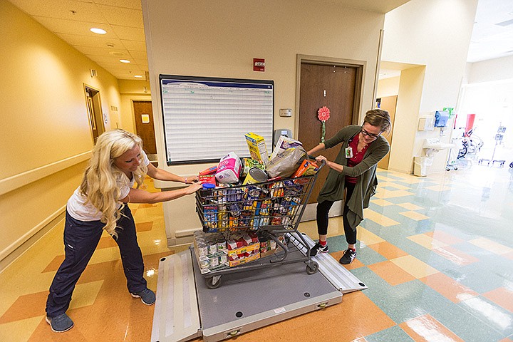 <p>SHAWN GUST/Press</p><p>Dorcey Earle, therapy director for Northern Idaho Advanced Care Hospital, left, and Lisa Noland, director of nursing for Rehabilitation Hospital of the Northwest, position a cart with hundreds of pounds of food items onto a scale at Northern Idaho Advanced Care Hospital Wednesday as they tally up the totals of a food drive competition between the two Post Falls hospitals. More than 1,495 pounds of food and nearly $1,100 in cash was raised in all to benefit the Post Falls Food Bank. Northern Idaho Advanced Care Hospital came out as the winner in the competition.</p>
