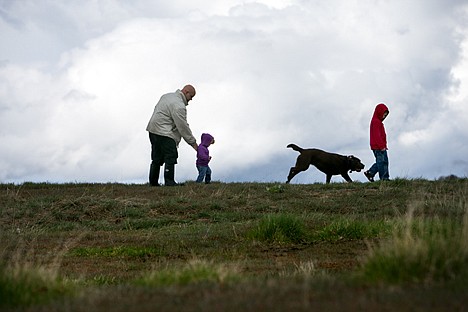 <p>GABE GREEN/Press</p><p>Sean, Kamryn, 1, Pepper, and Keegan Erickson, 5, take an afternoon walk Thursday in a field near West Canfield Avenue in Coeur d’Alene.</p>