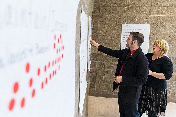 <p>SHAWN GUST/Press</p><p>Mark Lee, music teacher at River City Middle School, places a red dot sticker next to a category that he feels should be considered as a budget priority as Kandi Kuck, principal at Frederick Post Kindergarten, contemplates her choices. Post Falls School District staff, administrators, parents and board members met on Tuesday at Post Falls High to propose budget priorities for the next fiscal year. The top request was to maintain or increase salaries and benefits, followed by adding elementary computer aides and a behavioral specialist. The district …