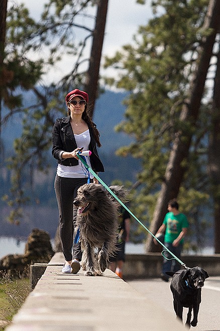 <p>SHAWN GUST/Press</p><p>Danielle Grundel, of Coeur dAlene, and her dog Rafe walk on the sea wall as her black lab Lola strolls on the street Monday near near the city beach.</p>