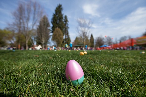 <p>GABE GREEN/Press</p><p>A brightly colored plastic egg lies in the grass as children await the start of the Real Life Ministries Easter egg hunt Saturday morning at Phippeny Park in Coeur d’Alene.</p>